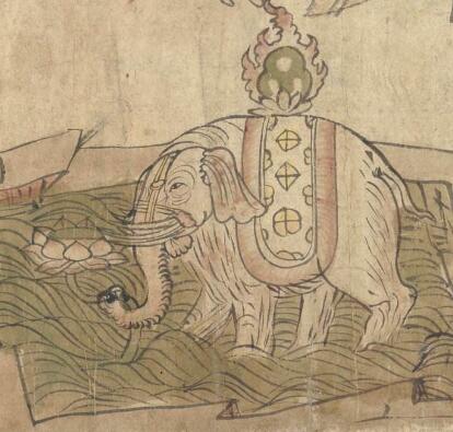 佛即讲起了以前的故事:以前,有一头长了六支牙的白象,它有两个妻子,一个叫贤,一个叫善贤。