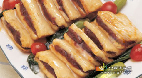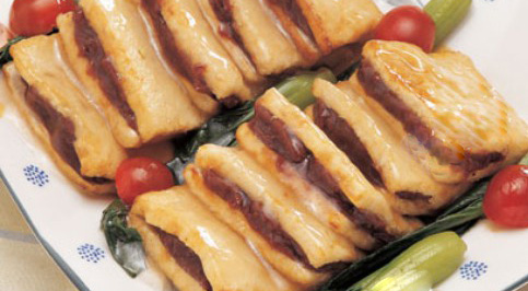 2. 锅中放油,将煮好的豆腐一面煎成金黄色后取出,在熬好的豆腐中间划一刀,使其成一个豆腐袋,中间放入红豆沙馅;