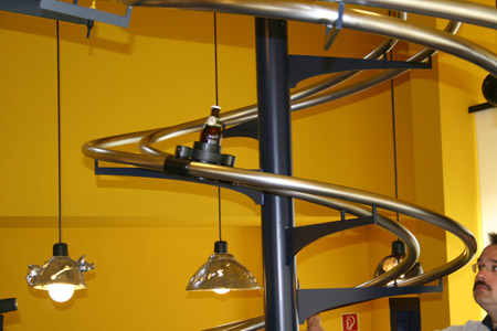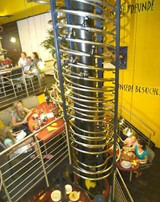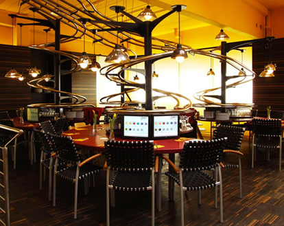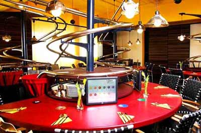 客人入座以后,可以通过餐桌上的触摸屏、甚至是通过发电子邮件和短信息来点菜。而上菜则是通过一个螺旋样的传送带送到您的桌边。