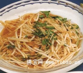 2、金菇、素玉翅和素火腿丝一起入油锅炒熟,再加入银芽及调味料快速拌炒均匀,起锅时加入香菜即可。