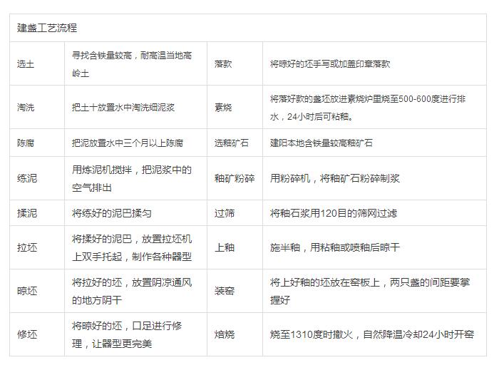 建盏的传统手工制作技艺流程,要经过 选土→淘洗→陈腐→练泥→揉泥→拉坯→晾坯→修坯→落款→素烧→选釉矿石→矿石粉碎→过筛→上釉→装窑→焙烧等16道工序。