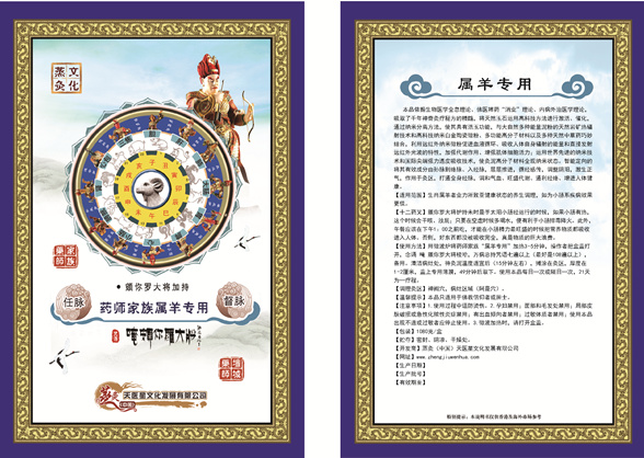 【使用方法】用微波炉将药师家族“属羊专用”加热3~5分钟,操作者把盒盖打开,念诵“唵頞你罗大将 梭哈”咒语七遍以上(最好是108遍以上),备用。清洁病灶处,待灸泥温度适宜后(15分钟左右),摊涂在灸区,厚度在1~2厘米,盖上专用薄膜,49分钟后取下。使用本品每日一次或隔日一次,21天为一疗程。