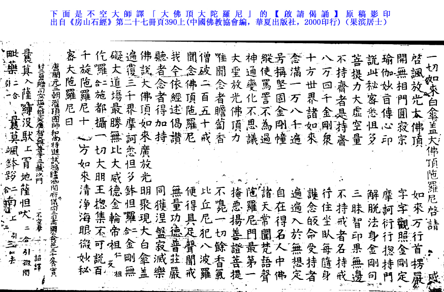「大佛頂大陀羅尼」的【啟請偈誦】原稿影印出自《房山石經》第二十七冊頁390上。