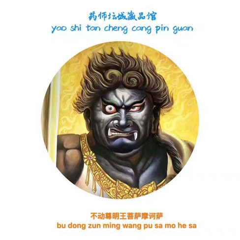 不动明王亦称不动尊菩萨,其名号梵音为Acalanatha,意为不动尊或无动尊,教界称为“不动明王”,亦谓之不动使者。“不动”,乃指慈悲心坚固,无可撼动,“明”者,乃智慧之光明,“王”者,驾驭一切现象者。依密教三轮身之分类而总判,不动明王为一切诸佛教令轮身,故又称为诸明王之王,五大明王之主尊。不动尊菩萨是理性的象征,能够默默保护您,能使您在人生的道路上知错知过,把握人生的每一次机遇,很好的利用自身的智慧,应付种种困境,使您事业有成,家庭幸福,吉祥如意。
