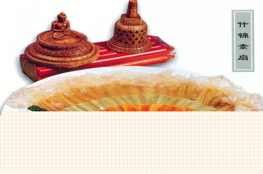 2.炒锅上火倒入少许素油,加入素汤,烧开后放入精盐、味精,用湿淀粉勾稀芡,淋在扇面图形上即成。特点外形别致,色泽美观,口