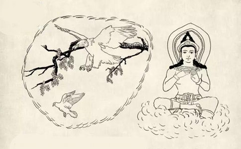言毕,毗首羯磨便化作一只鸽,帝释天王变成大鹰,凶猛地紧跟在鸽子后方,穷追不舍。