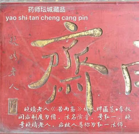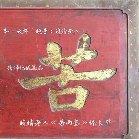 晚晴老人《苦雨斋》楠木牌匾蕊(弘一大师:晚号晚晴老人),外框佚。因年代久远,略有磨损(老文玩精品之作)。