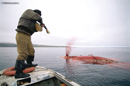 猎人用标枪射杀灰鲸。俄罗斯西伯利亚