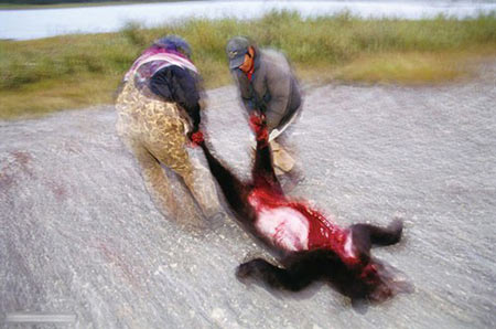 工人拖行着被屠宰的美洲黑熊。阿拉斯加科伯克谷国家公园