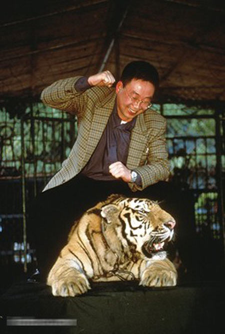 游人跨在被铁链拴牢的老虎身上哈哈大笑,地点中国云南