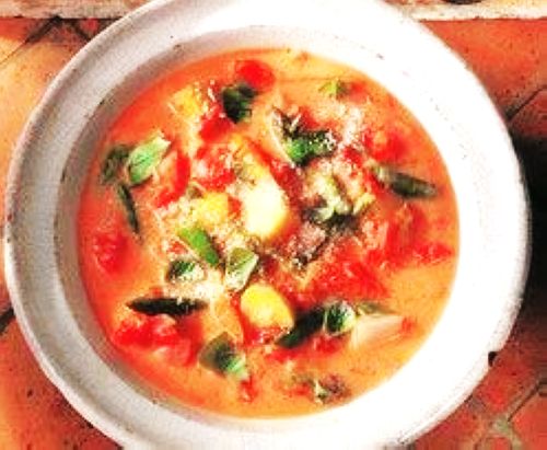 蔬菜沥干,放入番茄汤中。