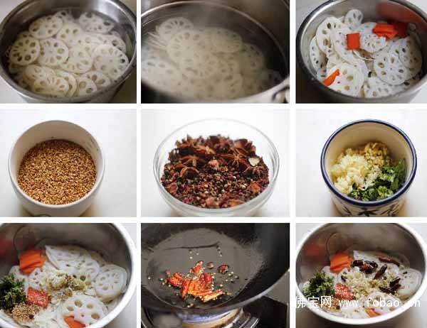 莲藕,胡萝卜,蒜末姜末,五香粉,盐、糖,味精、醋(白醋最好)、香菜、芝麻等