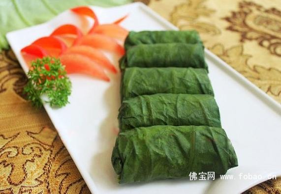 5、上菜时将包好的荷叶粽放入蒸笼蒸熟热拿出摆入盘中即可。