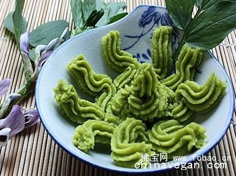 蚕豆放至稍凉,用一个筛子把蒸酥的豆瓣压成泥,加上麻油和盐拌匀,装进裱花袋里,挑大号菊花嘴,先挤一下练练手,再挤在盘子里,挤成花形。如此这般,好看又好吃的豆瓣酥就做好了: