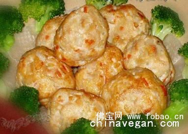 4、油锅入油,油温八成热时,把搅拌好的素肉豆腐浆做成圆球,再入油炸至金黄捞出沥油装盘。四周放上西兰花