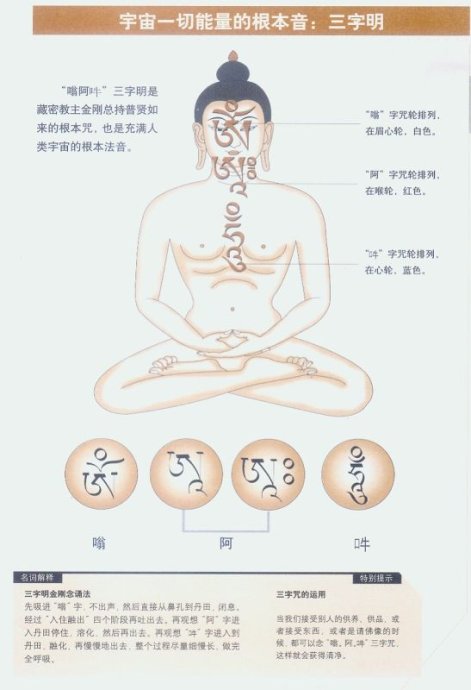 “嗡阿吽”三字明是充满人类宇宙的根本法音。佛部、莲花部、金刚部的声密。