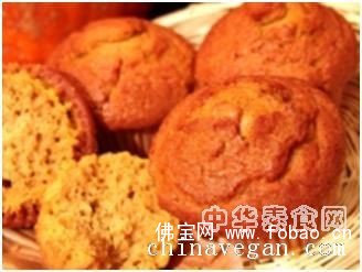 食材:2 杯全麦烘焙粉、1茶匙泡打粉、1/2茶匙苏打粉、1/2茶匙盐、1/2茶匙肉桂粉、1/2茶匙肉豆蔻、1/2茶匙糖、115 盎司南瓜罐头一罐 、1/2杯水 、1/2杯葡萄干