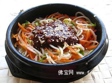 1、豆芽洗净,胡萝卜擦丝,入沸水中煮熟后捞出,加盐和芝麻油拌匀。