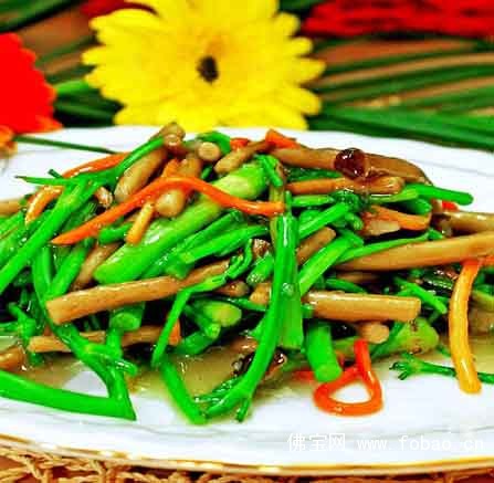 (6)锅里放少许油,煸香姜末,然后将茶树菇、野芹菜、胡萝卜丝一起煸炒,火要旺,动作要快,这样炒出的菜才具有菜香味。最后,调味可以勾一点点薄芡,淋少许香油,出锅装盘即可。