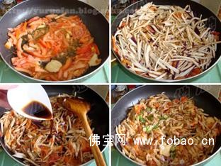 2、炒锅内倒入适量油烧热,油热后放入生姜爆出味道后放入西红柿爆炒几下后倒入茄丝儿一起翻炒;