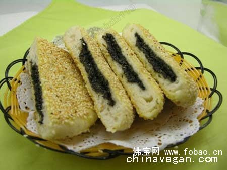 饼放入盘中,使之两面粘上白芝麻,用擀面杖将饼上的芝麻擀实(只