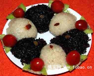 1、将两种米分别洗净、蒸(烧)熟,放入枣子、糖,做成自己喜欢的形状,摆放在盘中;