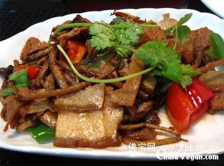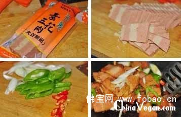4、起锅热油,将要花椒粉炒香,下入素五花肉片轻轻煸炒。