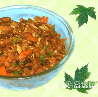 原材料:黄花菜、大豆蛋白素肉块、大豆豆瓣酱、青椒、胡萝卜、姜末少许(量可以按自己喜好确定)。