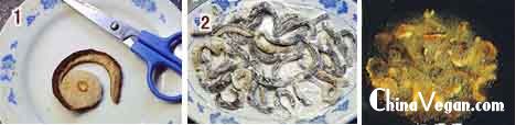 1、将香菇剪成圆弧形长条,撒上少许盐,干淀粉,用手抓匀;