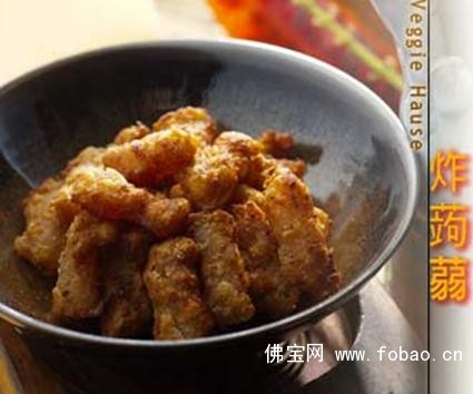 3、将浸泡好的蒟蒻下锅油炸,起锅后洒胡椒即可食用。