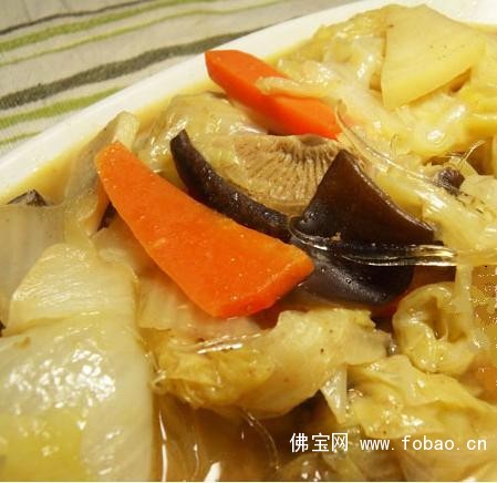 材料:白菜、素鱼翅 (素食材料行可以买到,或是选择喜欢的材料来取代)、红萝蔔、木耳、泡软的乾香菇、笋片、姜片