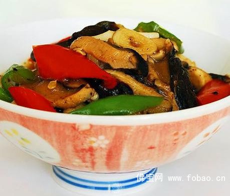 3、再将香菇、青辣椒、红辣椒入锅翻炒片刻,加生抽,黑糊椒继续翻炒断生。