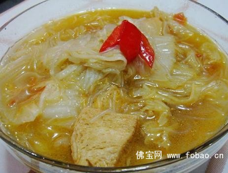 3、起锅热少许油,先爆香姜末,加入两大碗水,放入白菜和冻豆腐块一起用大火煮滚,转小火炖10分钟左右,用盐、酱油、蘑菇精、少许白胡椒粉调味,最后放入泡好的粉丝,滚上2分钟后就可出锅了。