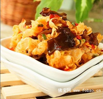 1、将黑木耳与白木耳提前3至4小时用冷水泡发后去蒂洗净,撕成小朵;泡椒、生姜、大蒜均切碎成末,葱切花;