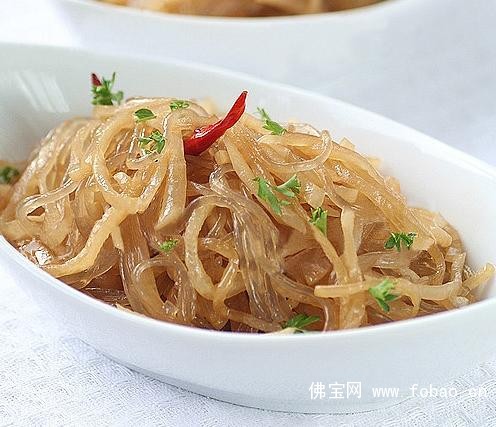 1、粉条洗净,用开水浸泡。泡软后,剪成10cm长的段,沥干水分备用。白萝卜去皮洗净后,切成细丝。