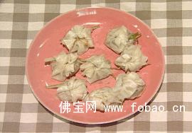 3.最后馄饨皮包入馅料后,以芹菜梗固定后入锅蒸熟后,美味的白云包就大功告成罗。