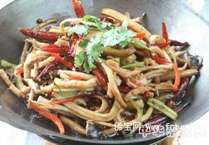 (2)另起锅热油,加入适量豆瓣酱、干辣椒炒香,然后加茶树菇、青红椒、香芹一起翻炒,用蘑菇精、生抽、花椒油调味;