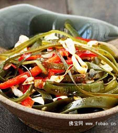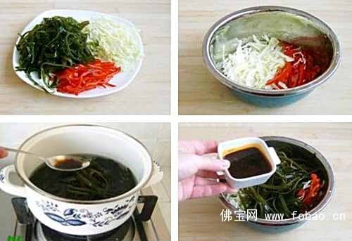 1、海带洗净切成细丝,入沸水锅中烫过,烫时可以加一勺醋
