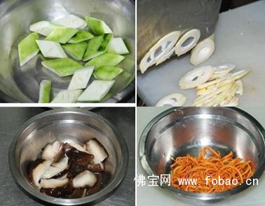 食材:胜瓜、新鲜香菇、虫草花、素鸡肉浆、素小虾、竹笋
