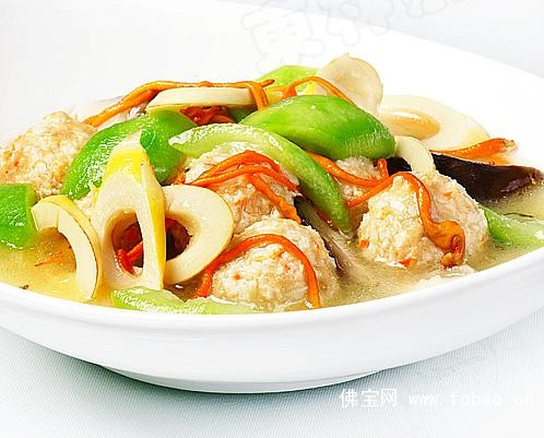 9. 锅内留少许精制油,放入姜片煸香,放入香菇片、竹笋片煸炒,加少许素上汤,放入胜瓜、素虾丸拌匀。调味盐、蘑菇精,略微煮一会儿,放虫草花,勾一点点薄芡,出锅装在盘内即可。
