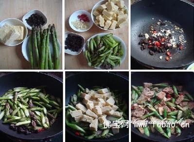 材料:芦笋,冻豆腐,豆豉,蒜末,小红辣椒