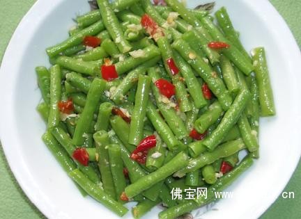 提示:佛水要没过豇豆、水中要先加盐、这样豇豆可入盐味,又可保持色泽鲜艳。
