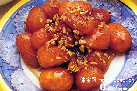 3、炒锅去油置旺火上,加入清水300克,放冰糖熬化,放入过油的红薯,煮至汁粘,加入蜂蜜,撒入红枣末推匀,再煮5分钟,盛入盘内即成。
