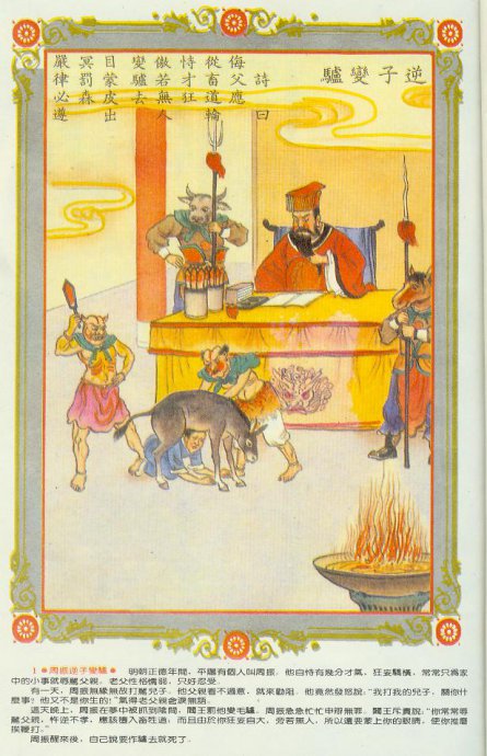 这天晚上,周振在梦中被抓到阴间,阎王罚他变毛驴。周振急急忙忙申辩无罪。阎王斥责说:“你常常辱骂父亲,忤逆不孝,应该堕入畜生道,而且由于你狂妄自大,旁若无人,所以还要蒙上你的眼睛,使你推磨挨鞭打。”