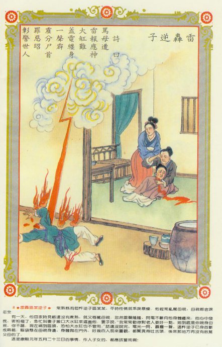 有一天,他回家时见饭还没有煮熟,就又辱骂母亲。忽然雷声隆隆,闪电不断向他身体缠来。他心中发慌,害怕极了,急忙叫妻子搬口大水缸来遮盖他。妻子说:“我常常劝你对老人好一点,她到底是你亲身母亲,你不听。现在祸到临头,恐怕大水缸也不管用。”话还没说完,电光一闪,霹雳一声,这忤逆子已身首断成两截。脑袋悬在母亲身边,身体抛在门外。好几百人前来围观,都惊异得吐舌头。后来那地方再没有敢骂父母的了。