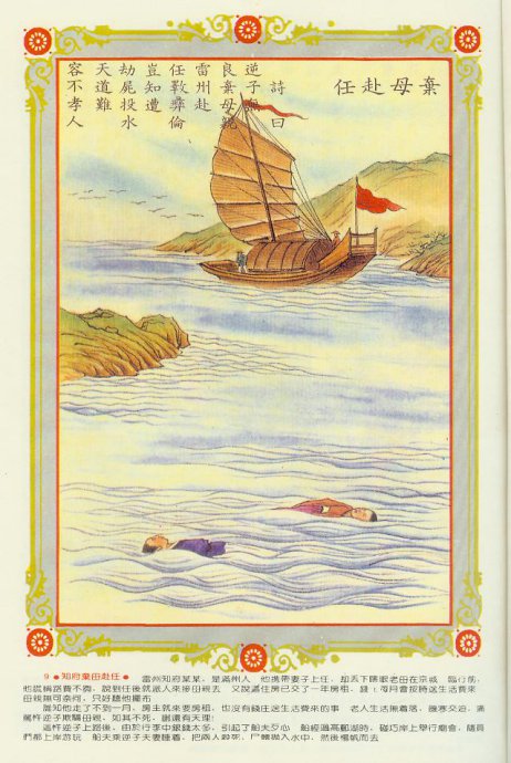这忤逆子上路后,由于行李中银钱太多,引起了船夫歹心。船经过高邮湖时,碰巧岸上举行庙会,随员们都上岸游玩。船夫乘逆子夫妻睡着,把两人杀死,尸体抛入水中,然后扬帆而去。