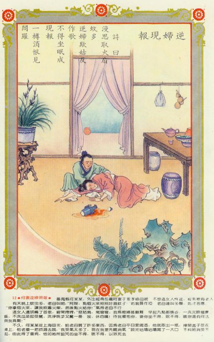 不久,何某某从上海回家,给老母买了许多东西,因为老母平日爱喝酒,他就取出一瓶,拧开盖子放在桌上。他老婆一把抓过去说:“我受气太多了,现在我要先喝消气。”说完咕嘟咕嘟喝了一大口,不料她消受不起,由此得了重病,恰如她所诅咒的坐不得,眠不得,以致死去。