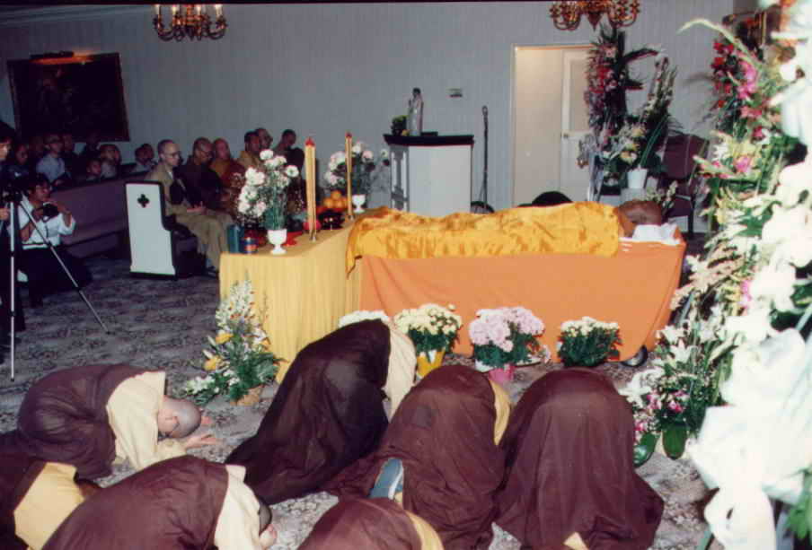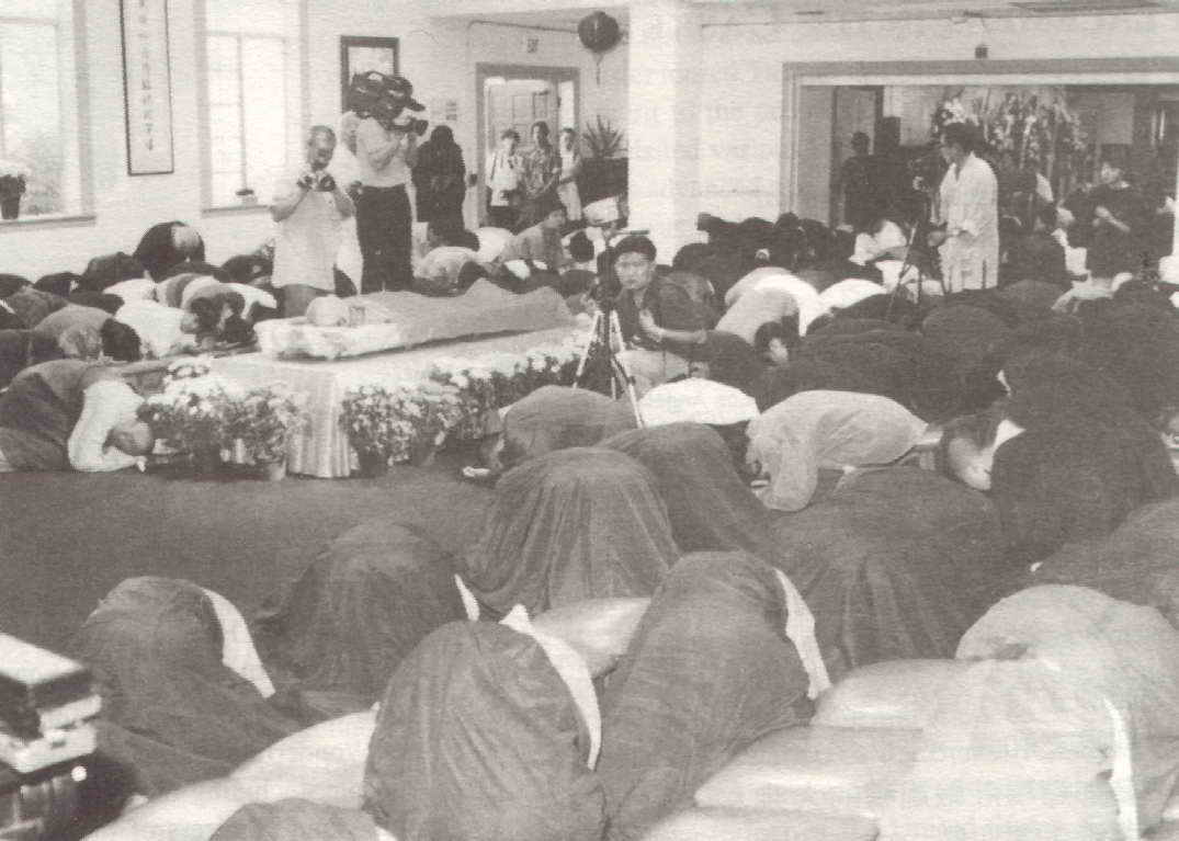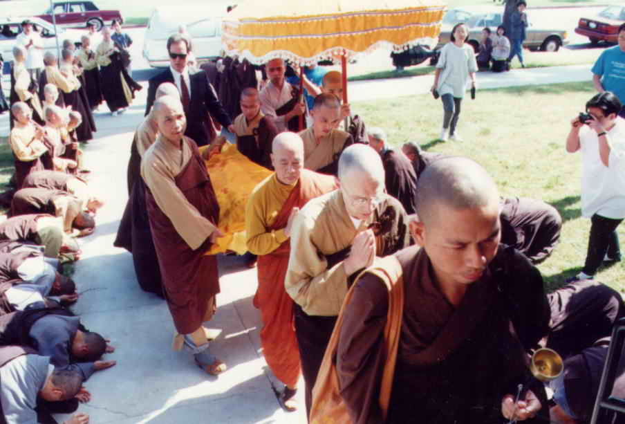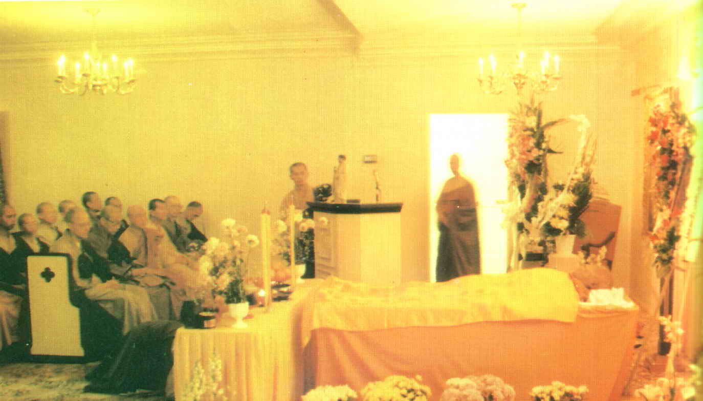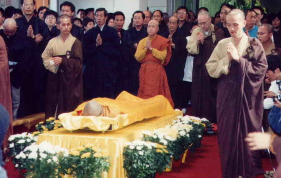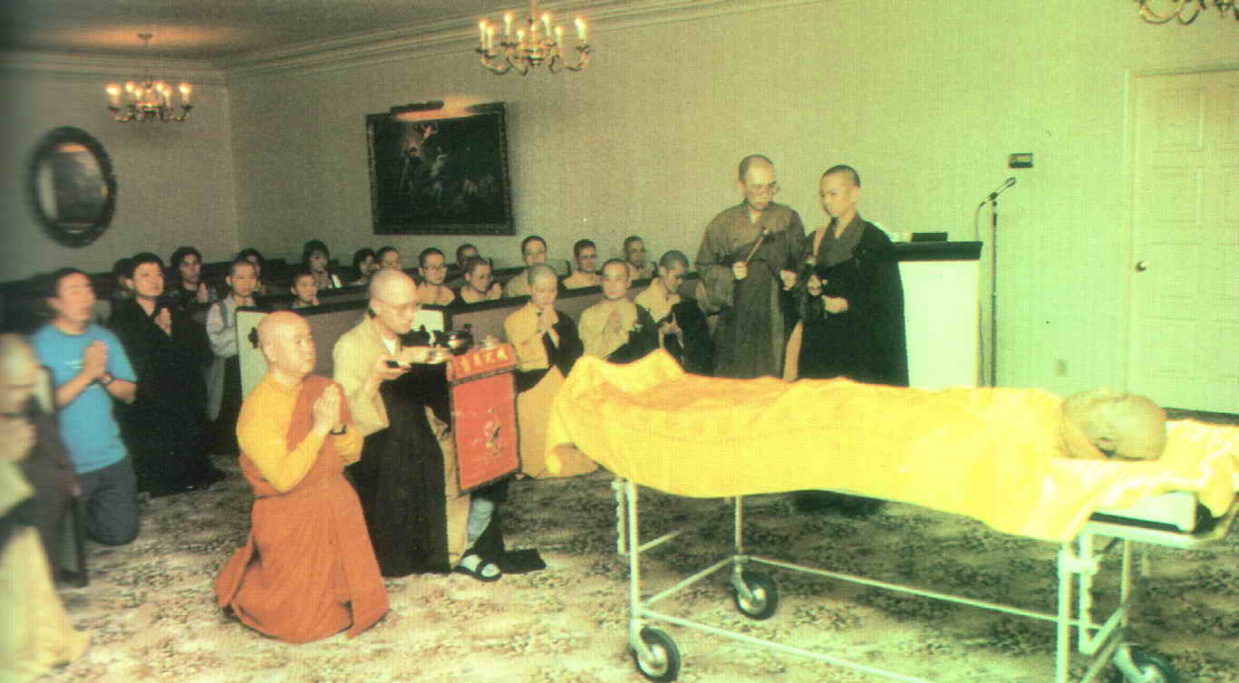 1995年6月7日,一代高僧宣公上人于美国洛杉矶圆寂,世寿78岁,慧灯遽殒,人天同悲。法界佛教总会四众弟子,谨依师遗训,各道场举行念诵《大方广佛华严经》、念佛法会四十九天。六月十二日于长堤圣寺举行入殓大典,六月十六日移灵至万佛圣城,七月二十六~二十八日于万佛圣城举行追思大会暨荼毘大典。上人生时,既不要名,也不要利,临终遗言亦复如是:“我走后你们可以诵《华严经》、念佛,你们要多少天就多少天,或者一个七,或者七个七。火化之后,把我的骨灰洒到虚空去;旁的事情我什么也不要,不要给我造什么塔,什么纪念馆。我来的时候什么也没有,走的时候,还是什么也不要,在世上我不要留什么痕迹。” 老和尚说 :“我从虚空来,回到虚空去。”