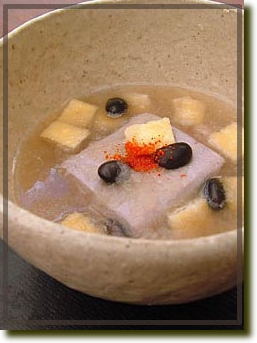 將研磨好的萝卜汁和油炸豆腐及黑豆豆腐等放入溶有葛粉的锅内加热,煮到快溢出锅的时候將火关小。