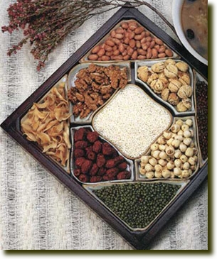 制作原料:用料多种多样,没有定规,可根据各地的习惯、各人的爱好和条件而定,凡五谷杂粮均可。在我国北方人们常用小米、赤豆、蜜枣、黄豆、米仁、桂圆、莲子、胡桃、松子煮成,其味香甜,可畅胃气、生津液。而在我国南方,人们则喜欢用白果、花生、莲子、红枣、板栗等,加上姜桂等调味品,掺在糯米中煮成咸味粥,温暖滋补,可以祛寒。